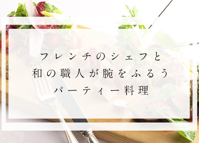 ゲストの皆さまも喜ぶシェフ渾身のお料理。ウェディングパーティーや二次会など、華やかな空間を演出いたします。